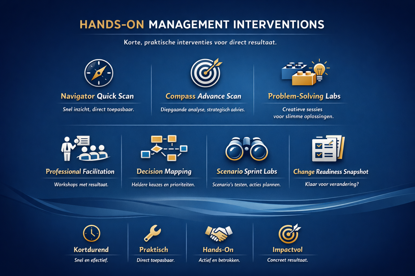Gerichte analyse en planning om vast te stellen welke managementinterventies op dit moment het meest effectief zijn. Op basis van een gestructureerde beoordeling van doelen, prestaties, knelpunten en context ontstaat helder inzicht in prioriteiten en impact. Het resultaat is een concrete interventieagenda met duidelijke keuzes, onderbouwing en direct toepasbare vervolgstappen – variërend van een snelle Quick Scan (Navigator) tot een diepgaande Advance Scan (Compass).